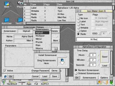 AlphaSave is a Programmable ScreenSaver. This means that you are able to program your own screensavers as part of the package. Full instructions are given on how to program them, but this is Version 1.25, with many more features (and bug fixes :-\). It is written by Marc Warne of Alpha Programming.
