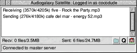 | 1.05Alpha (28-Oct-2001) | Automaticially reconnects if there are connection problems Able to launch homepage/queue URLs and see the main MP3 directory Sends proper IP adddress to Audiogalaxy (still does not provide hostname) Accepts 'Play' commands from the server Supports new Audiogalaxy 0.608W protocol Many bugfixes |